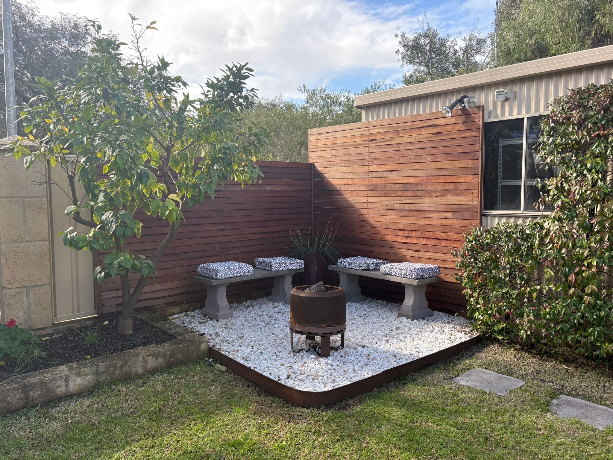 We designed and installed a custom fire pit with decorative stone flooring, sleek steel edging, and a timber screen for privacy and warmth. Using high-quality materials, we created a cozy, stylish space that’s built for both relaxation and durability.