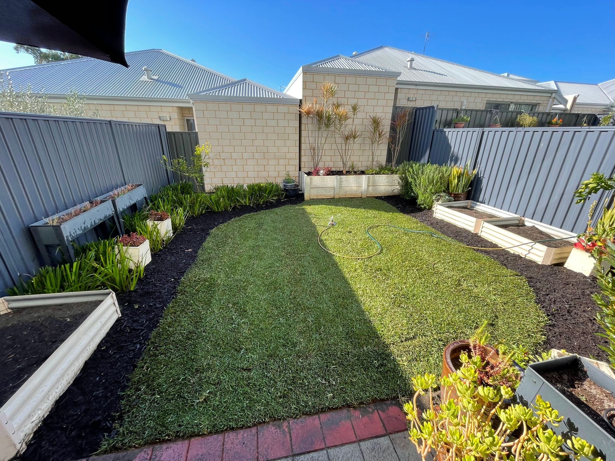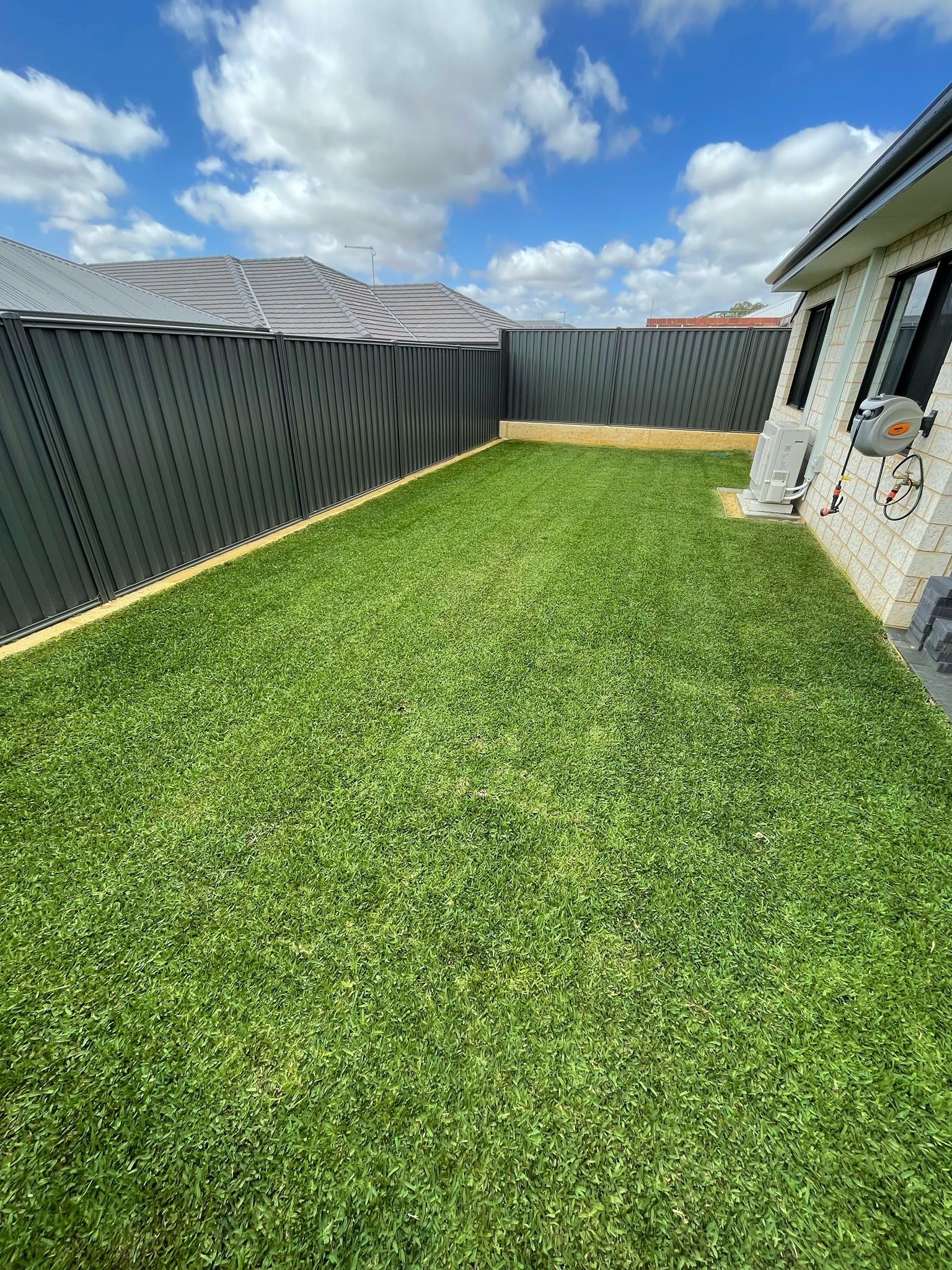 We gave this outdoor space a fresh update with a new lawn and a clean, well-defined garden bed. The lush turf adds life and colour, while the mulched bed brings texture and balance. The result is a tidy, inviting landscape that's both simple and low-maintenance.
