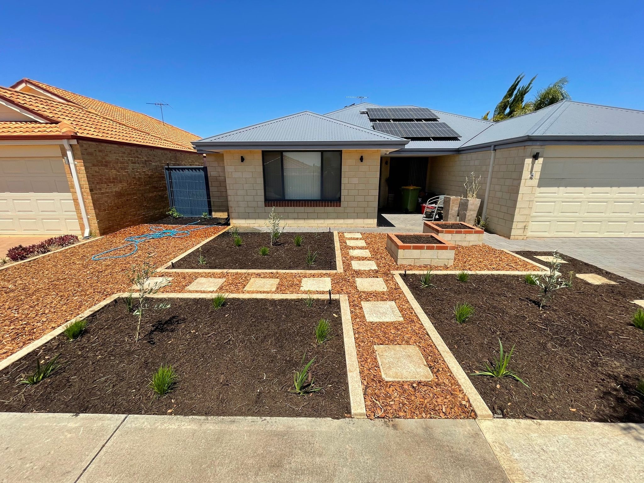 We transformed our client’s front yard with a custom design that blends style and functionality. Featuring multiple garden beds, a thoughtfully laid stone walkway, and a layout tailored for everyday use, the space now feels both welcoming and low-maintenance. It’s a practical upgrade that enhances curb appeal and makes the most of the outdoor area.